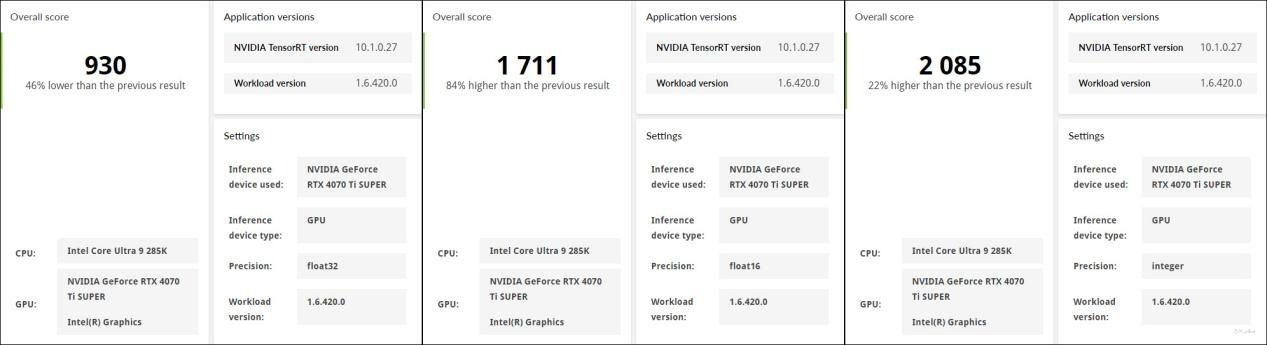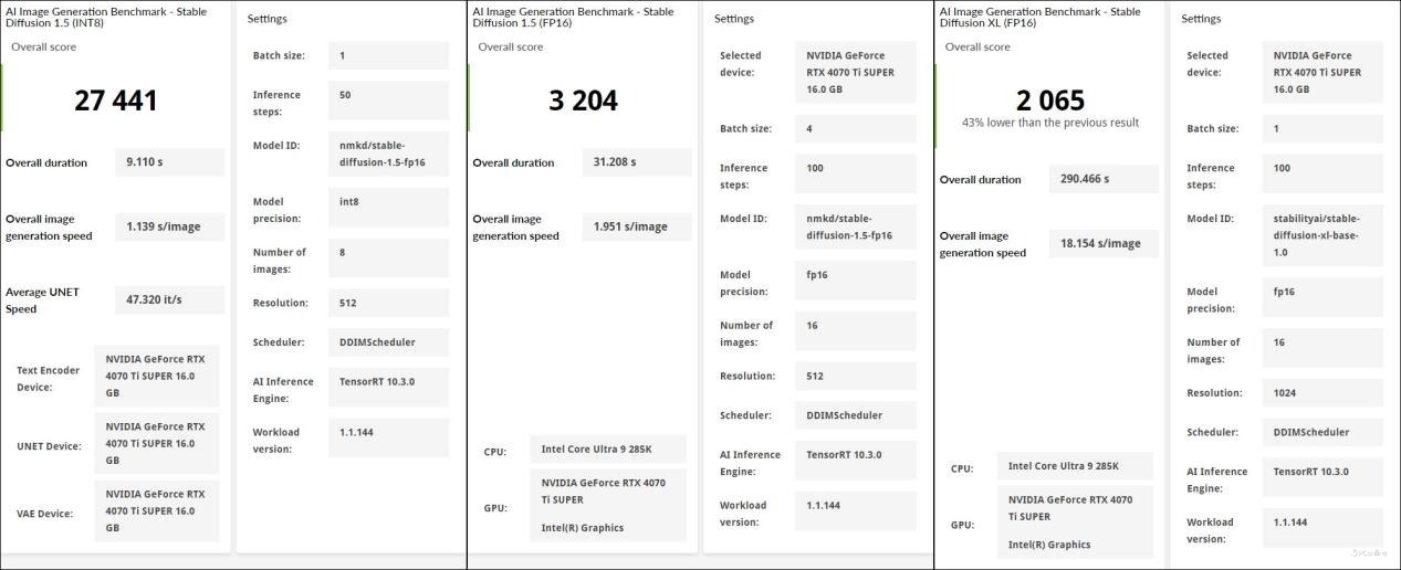 同时我们还利用UL Procyon进行了本地化Ai能力测试,影驰RTX 4070 Ti SUPER 金属大师Plus OC显卡得分还是比较高。其中Ai图片生成方面的速度相当猛,在SD 1.5 INT8的条件下得分已经达到了27441,即使来到SD 1.5 FP16得分也达到了3204,意味着1.951s即可生成一张图片。甚至在Ai图片生成分辨率更大的SD XL FP16测试也能实现较快的速度。