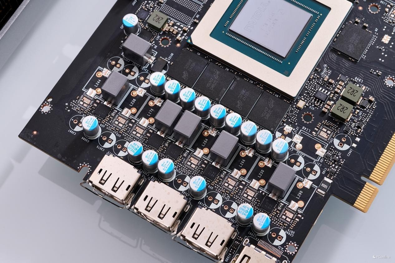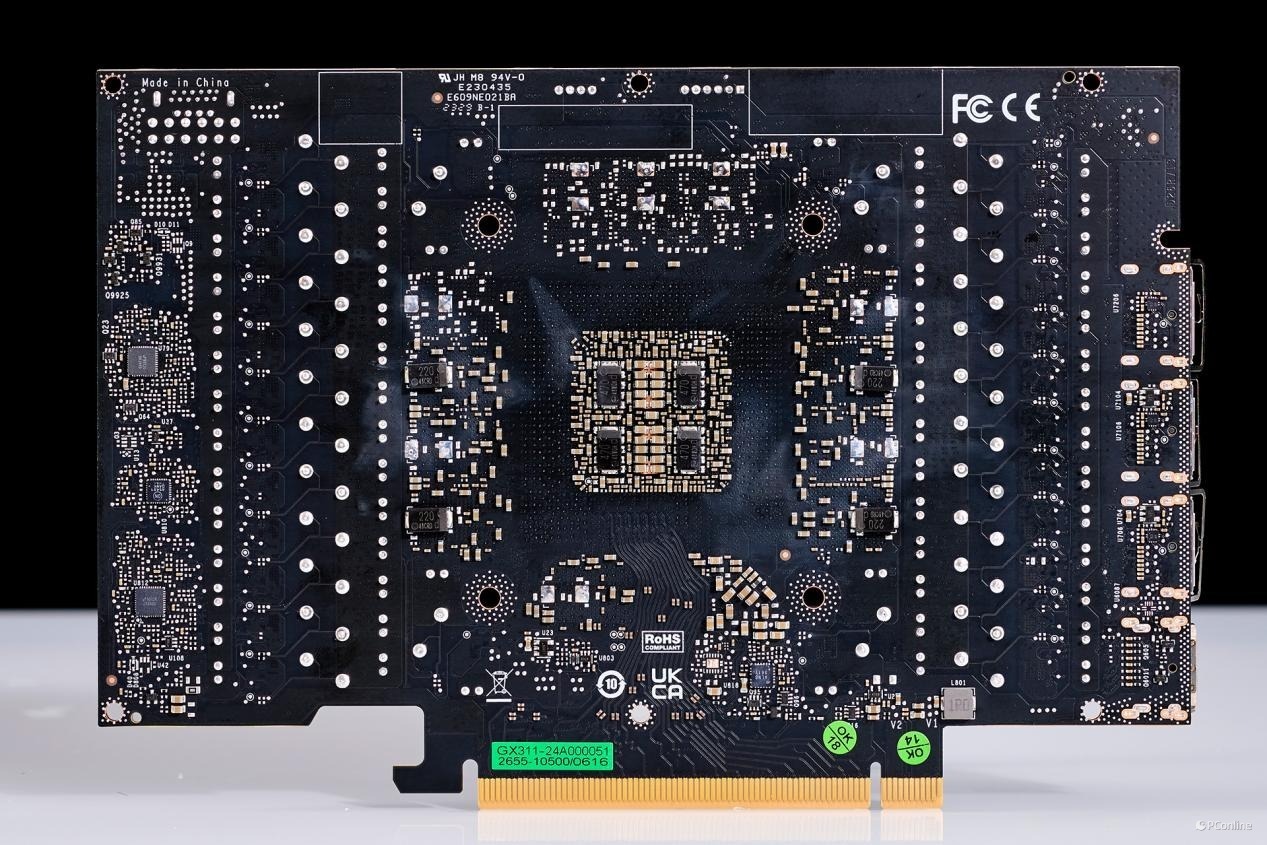 显卡PCB背部是显卡主要是放置显卡控制芯片,以及滤波电路;核心背部电容位置使用了四个POSCAP(导电聚合物钽电容)代替四组MLCC(一组10个MLCC),电气性能更强。