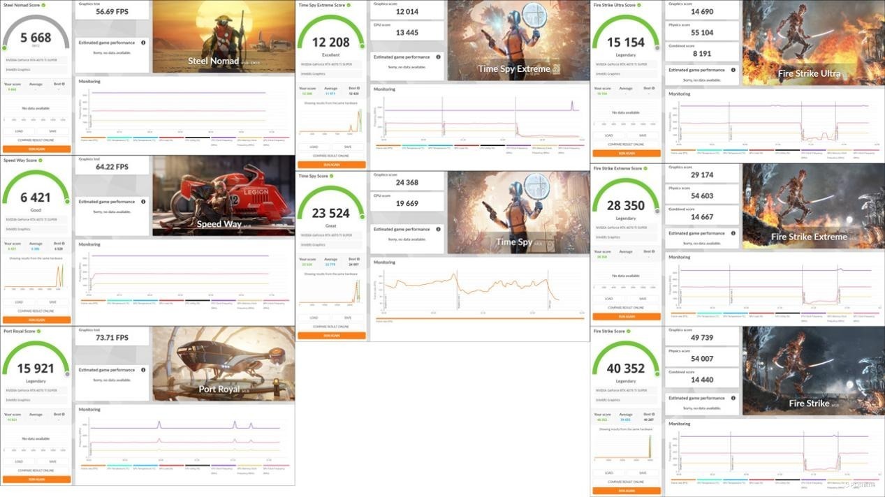 理论性能方向,仍是较为主流的3DMARK跑分软件,我们测试了最新的Speed Way、Fire Strike、Time Spy等项目。横向对比之前评测过的RTX 4070 Ti SUPER显卡,影驰RTX 4070 Ti SUPER 金属大师Plus OC显卡性能上有小幅度的提升,主要是更高的核心频率与更高的TDP设定,其次对比上代RTX 3070 Ti产品,完全是爆杀的存在,部分项目更是达到70%领先幅度。