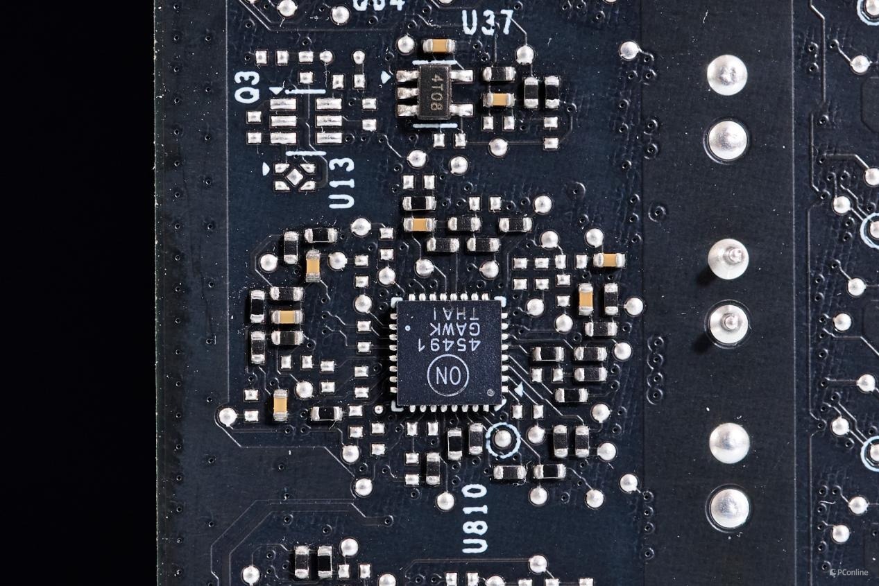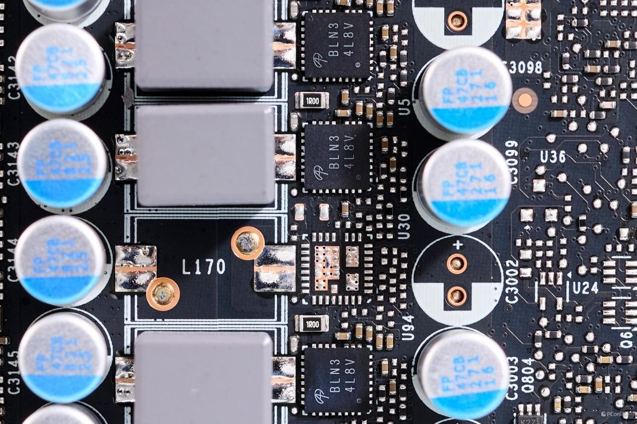 同时为了更强的供电能力,显卡配上了DrMos芯片,丝印编号:BLN3,具体产品为AOS出品的AOZ5311NQI-03,单颗最大持续输出电流为55A,10相核心供电共可达到550A。