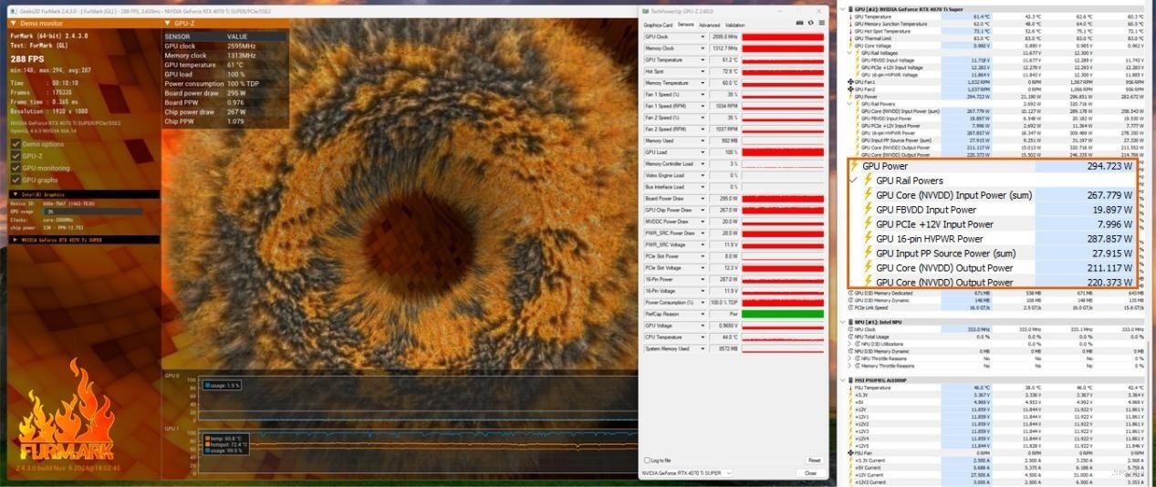 重点来了,影驰RTX 4070 Ti SUPER 金属大师Plus OC显卡升级的重点就是散热器,Furmark烤机表现相当是大家最为关心的。经常较长时间的Furmark V2单烤显卡之后,显卡频率稳定在2595MHz,显卡GPU温度仅为61.2度,热点温度为72.9度,显存温度也仅为60度,风扇转速也仅为35%,安静得很。