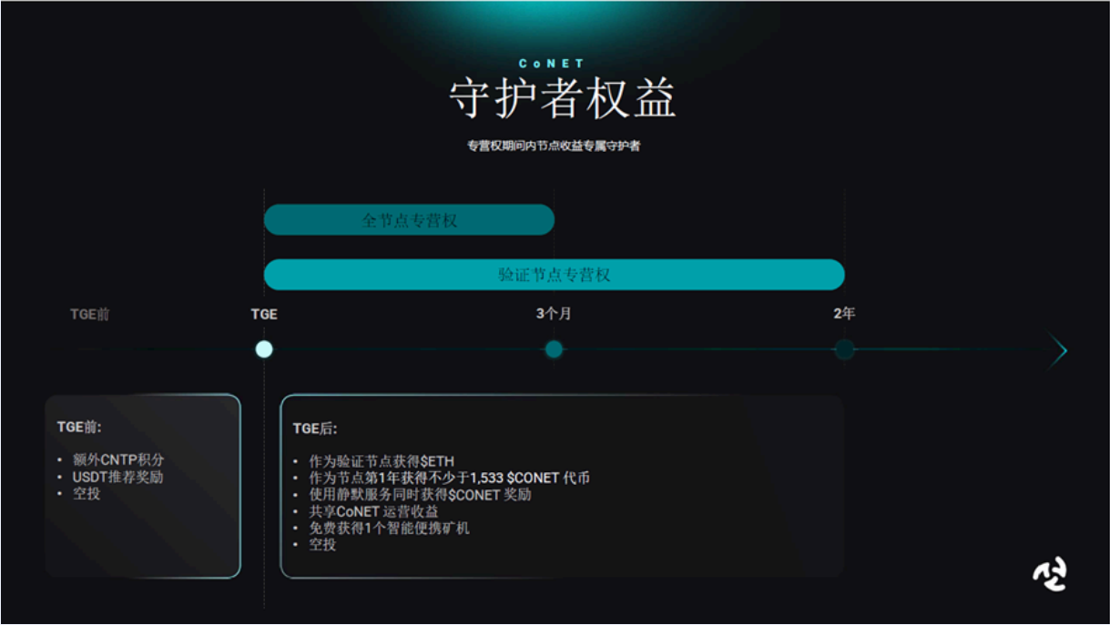 ● TGE后:验证节点$ETH奖励、1年不少于1533 $CONET代币、静默服务$CONET奖励、运营收益共享、免费智能便携矿机(集挖矿、数字钱包、无痕上网等多功能一体)、空投。
