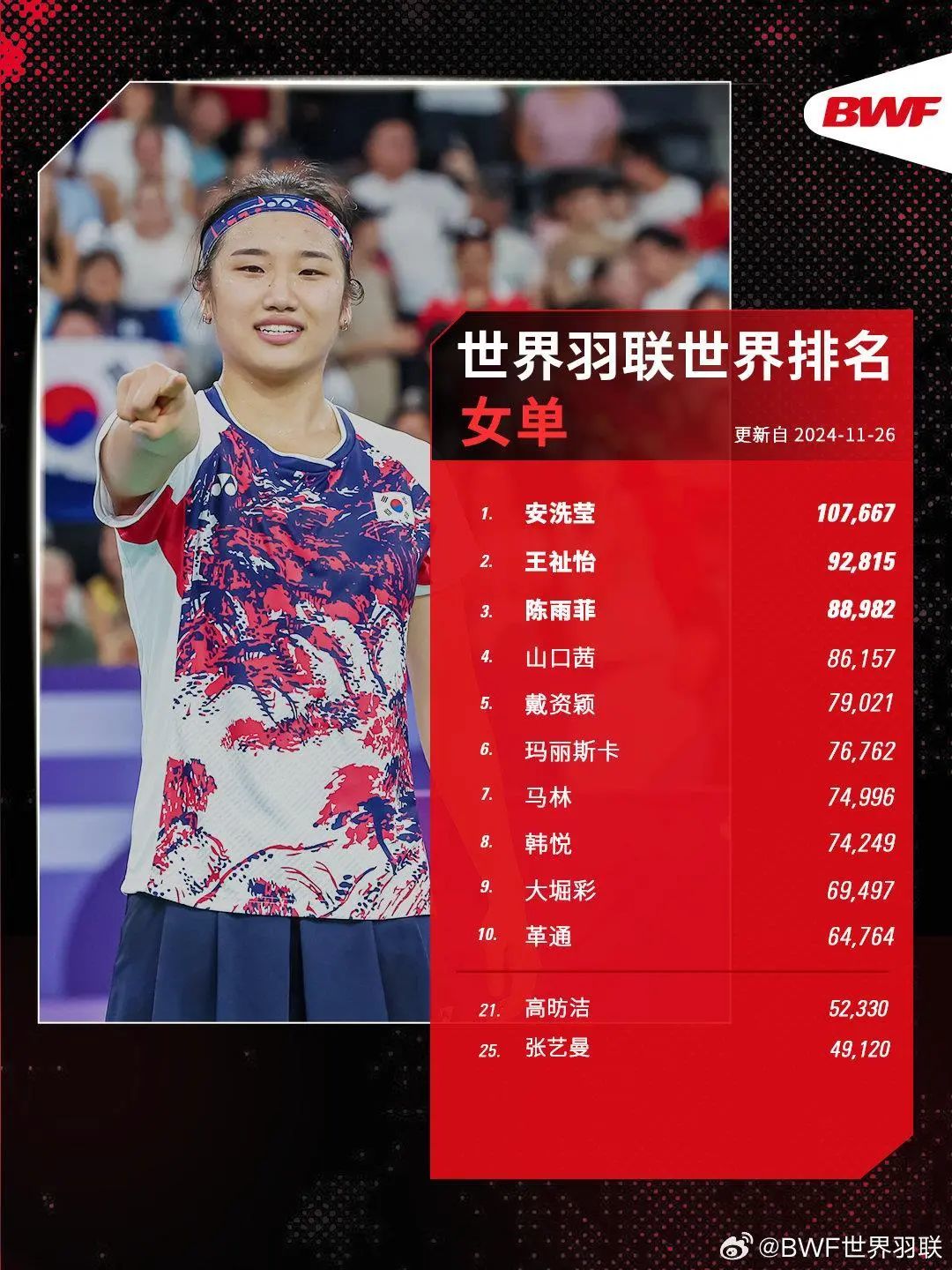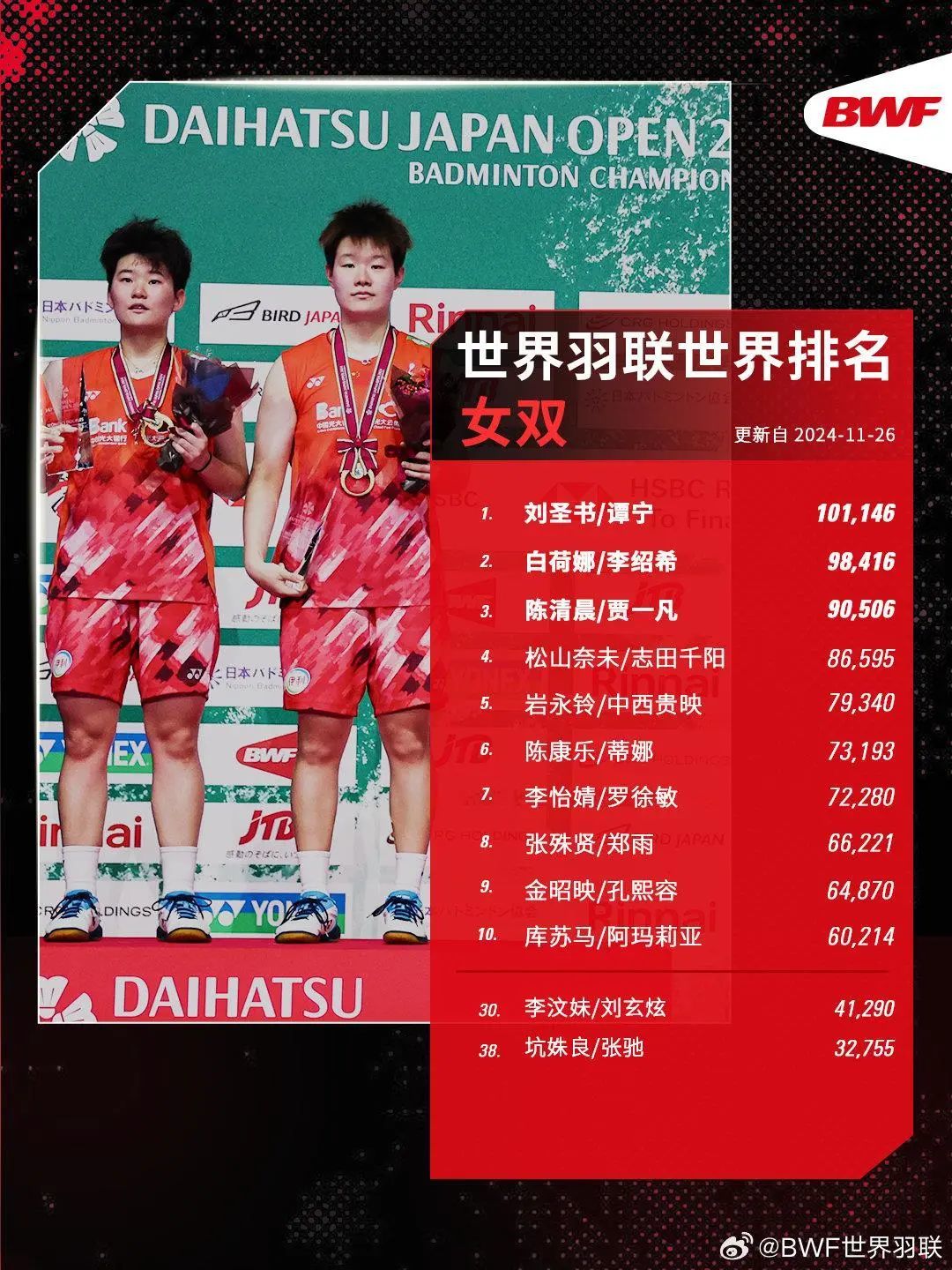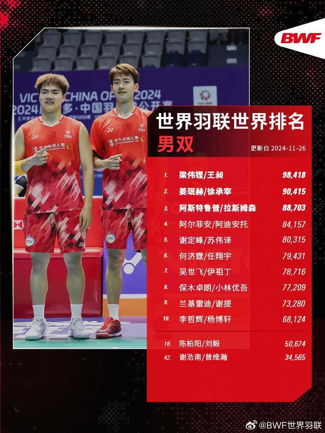 世界羽联2024年第48周世界排名公布,冯彦哲/黄东萍首次登顶世界第一。