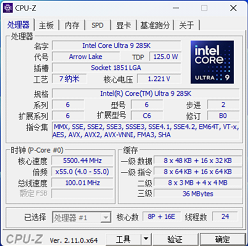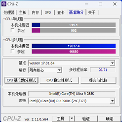 首先是CPU-Z信息与跑分,可见iGame Z890 VULCAN X在性能模式下将这颗Ultra 9 285K的睿频频率调整为大核5.5GHz,相比intel默认的5.7GHz似乎略低一些。跑分方面单线程得分919.1、多线程19037.4。