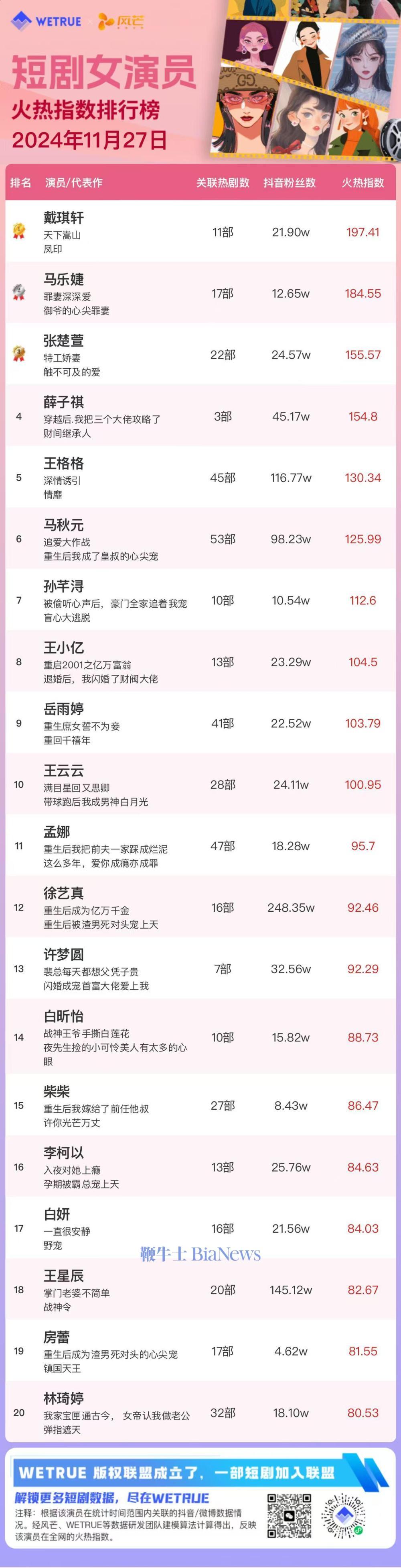 11月28日消息,为帮助短剧从业者提供更多信息,专注于短剧报道的新腕儿和科技媒体鞭牛士联合WETRUE短剧热度榜共同推出多种短剧热度榜。