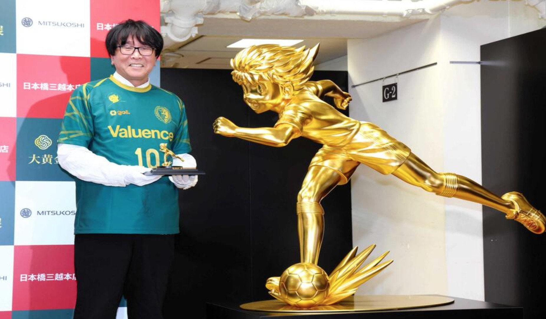 在三越日本桥本店举办的“大黄金展”上(三越是现存的日本历史最悠久的连锁百货商场),展出了人气足球漫画《足球小将》的等身黄金像。原漫画作者高桥阳一(64岁)和前日本国家足球队成员福西崇史(48岁)作为揭幕式嘉宾出席活动。