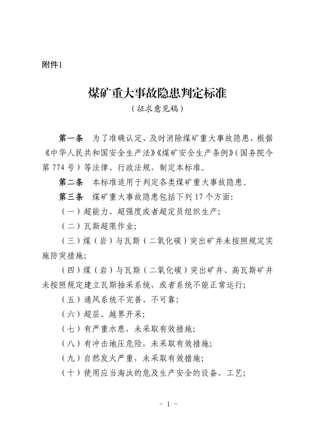 附件:1.煤矿重大事故隐患判定标准(征求意见稿)