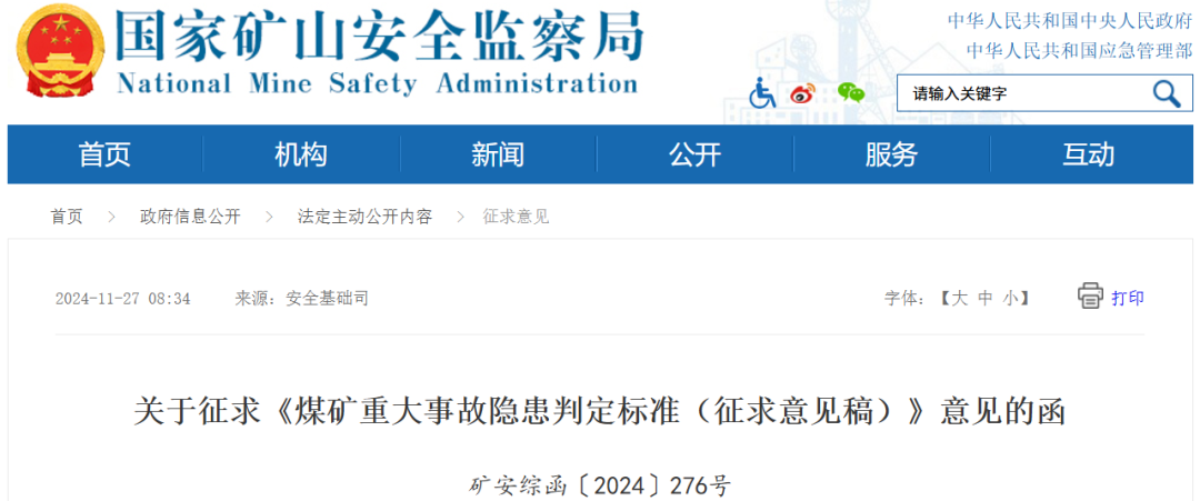 为准确认定煤矿重大事故隐患,防范和减少生产安全事故,国家矿山安全监察局组织对《煤矿重大事故隐患判定标准》(应急管理部令第4号)进行了修订,形成了《煤矿重大事故隐患判定标准(征求意见稿)》(附件1)。现向社会公开征求意见,意见反馈截止时间为2024年12月8日,反馈意见请填写《修改意见汇总表》(附件2),并发送至电子邮箱jcc4750@sina.com。