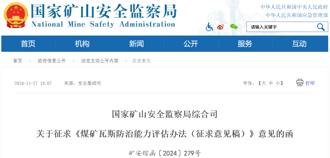 11月27日,国家矿山安全监察局发布《煤矿重大事故隐患判定标准(征求意见稿)》《煤矿瓦斯防治能力评估办法(征求意见稿)》。