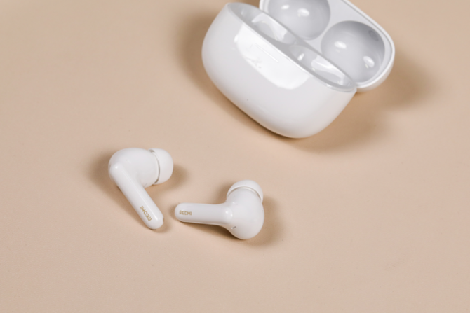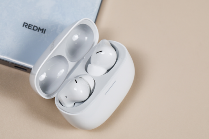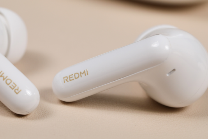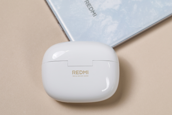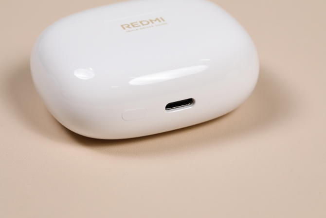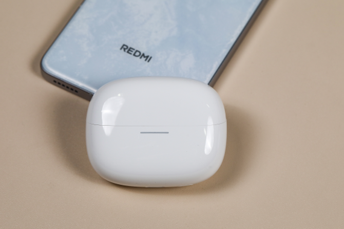 耳机柄印有全新的 REDMI 大写 Logo,进一步提升了辨识度。其充电盒设计小巧,易于携带,同时表面触感细腻,展现了一定的工艺水准