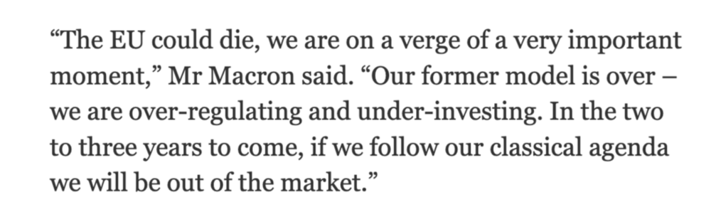 欧洲选择了监管和安全,而不是创新和增长。人才流失,公司避开投资,创新死亡,经济停滞,而随之而来的是更多的监管,形成了一个恶性循环。欧洲成了一个博物馆,擅长保护过去,却不擅长建设未来。欧洲的16年是高福利,避免破坏性经济,绿色理想、和不断增加法规的16年,现在的欧洲成为千万非法难民的新家,经济逐渐衰退,困在了自己的系统里。即便是法国总统马克龙也承认这一点: