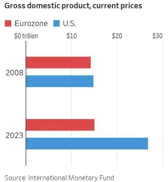 16年前,欧盟和美国的经济规模旗鼓相当。但如今,美国经济比整个欧盟的总和还要大50%。今天,美国的GDP是25.5万亿美元,欧盟的GDP是16.6万亿美元,而在2008年,它们几乎相等。现在,全球十家市值超万亿美元的公司,美国创造了其中9家,欧洲是零。