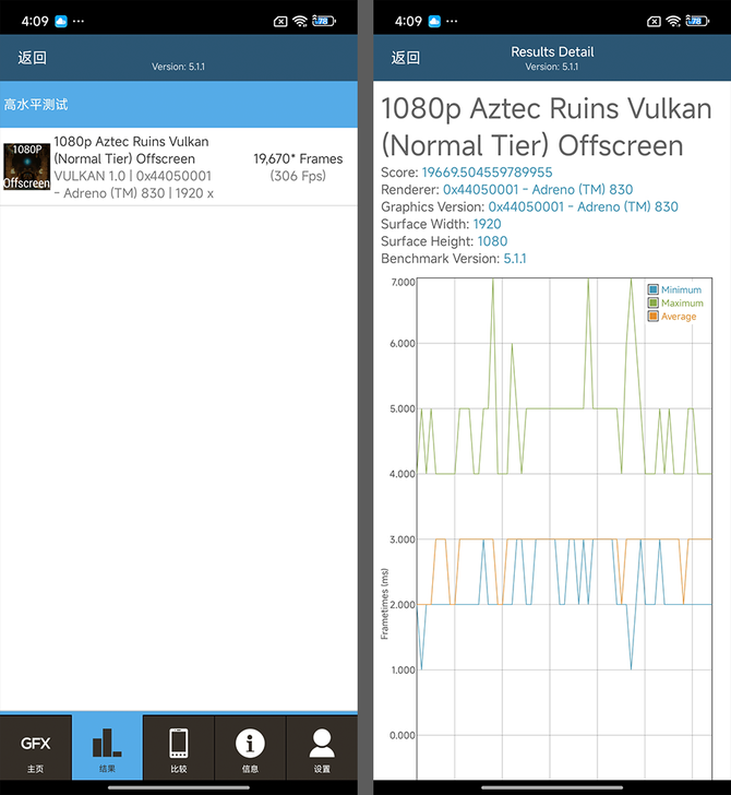 GFX Bench测试中,我们选择1080P Aztec Ruins Vulkan OffScreen进行测试,最终成绩为306FPS,性能表现非常优秀,GPU的性能领先绝大部分的安卓设备,是目前旗舰级的性能表现。