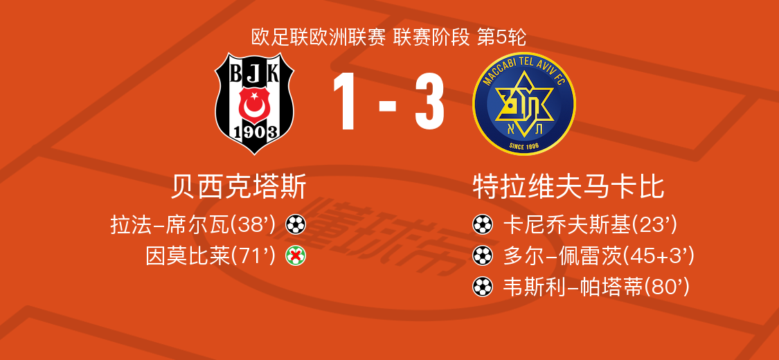 在欧足联欧洲联赛的较量中,贝西克塔斯迎战特拉维夫马卡比。比赛中,特拉维夫马卡比的卡尼乔夫斯基率先破门,展现了出色的进攻能力。随后,贝西克塔斯的拉法-席尔瓦凭借队友的助攻,将比分扳平。特拉维夫马卡比的多尔-佩雷茨在上半场结束前再次为球队取得领先。下半场,贝西克塔斯错失了一次点球机会,未能将比分追平。特拉维夫马卡比的韦斯利-帕塔蒂随后再下一城,锁定胜局。最终,特拉维夫马卡比以3比1战胜贝西克塔斯,取得了比赛的胜利。