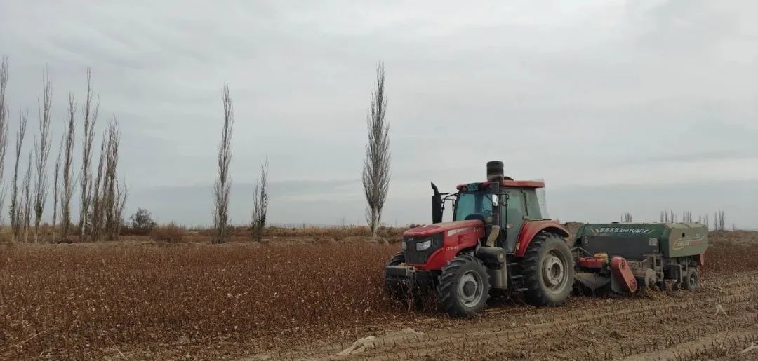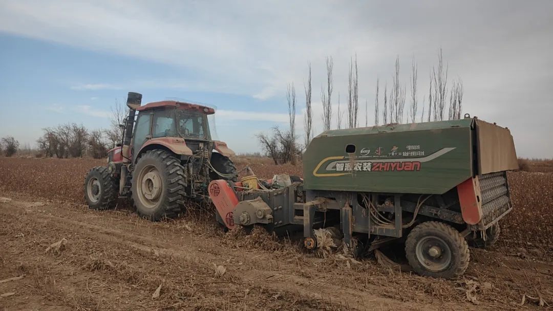 在瓜州县瓜州镇瓜州村机采棉棉田,伴随着机器的轰鸣,残膜回收一体机快速卷起棉秆和农用残膜,粉碎好的秸秆直接撒入田间,成为来年农作物生长的养分,卷起的农用残膜被打包成捆,进行回收利用。