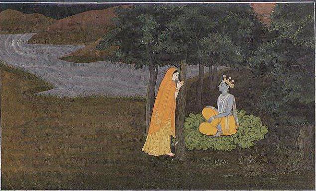 印度的一幅细密画。画中描绘的是印度教神祇奎师那(黑天)和他的妻子拉达的爱情故事,这是细密画非常常见的题材。奎师那的黄色裤子便是以印度黄绘制的(图片来源:onelittleangel.com)