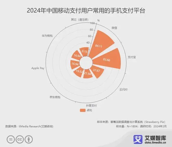 我们再来看艾媒咨询的一份数据报告,2024 年中国移动支付用户常用的手机支付平台中,微信、支付宝和云闪付位列前三,占比依次为 84.11% 、83.66% 和 37.67%。