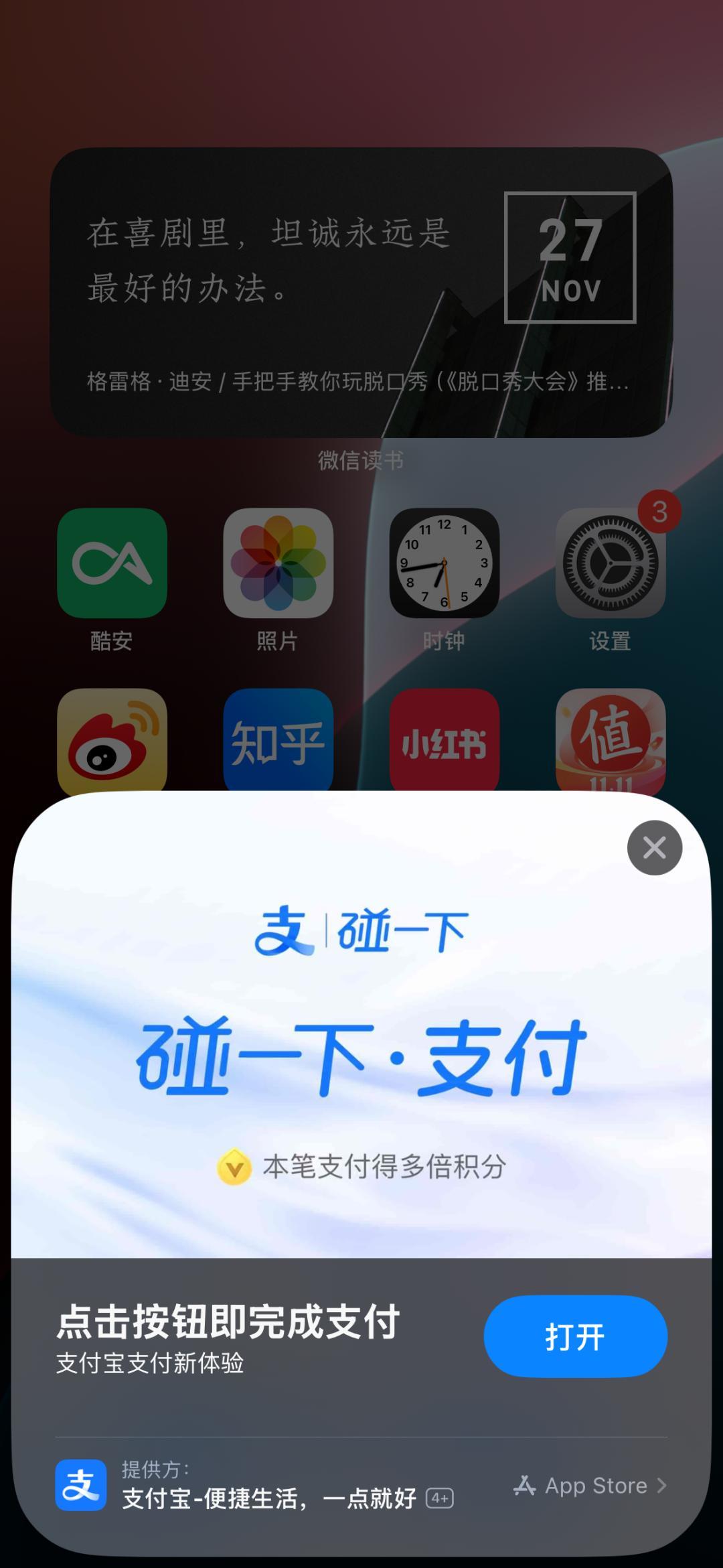 而在苹果系统下使用支付宝碰一碰后的界面是这样的,快占据屏幕一半的面积,在苹果高度封闭的系统和强大的生态话语权的情况下,能有这么一个“弹窗”,实属罕见。