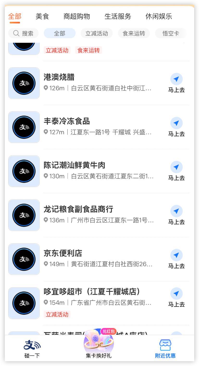 用户这边就是用碰一碰消费能有 0.1-20 元不等的立减金,还有集卡活动,以及抽免单。