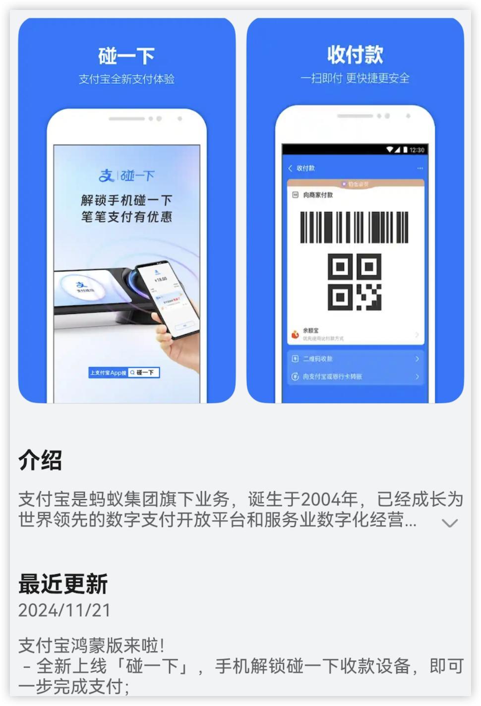 苹果、安卓、鸿蒙我们都试过。鸿蒙之前不行,在支付宝 11 月 21 号的这版更新后就支持了。