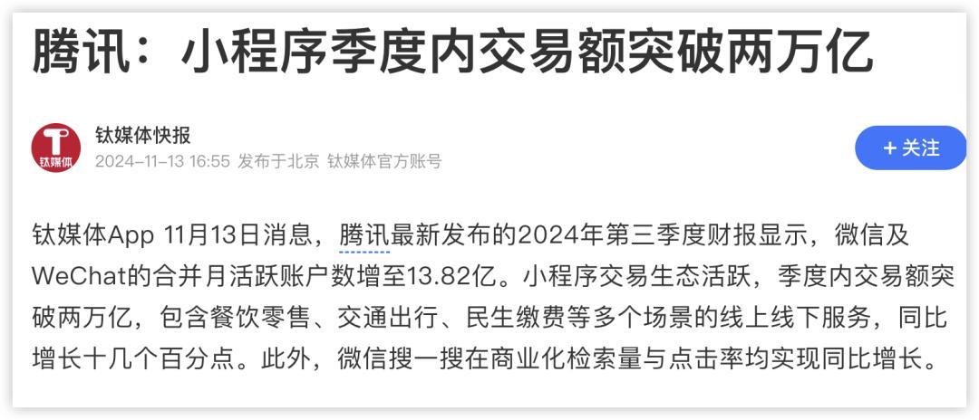 而根据腾讯最新的季度财报显示,微信小程序在季度内的交易额突破两万亿元。