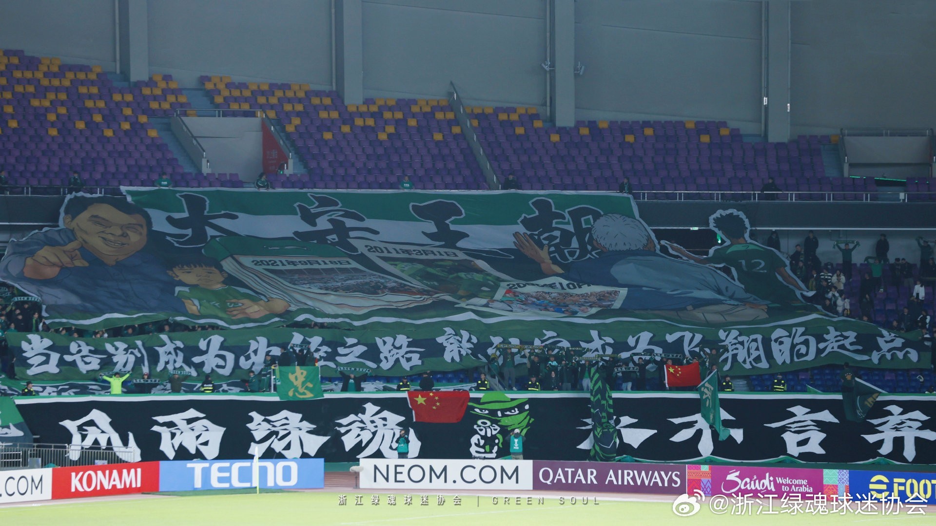 绿城核心球迷组织“绿魂”在微博发文,表达对球队前老板、“领路人”宋卫平的感谢。浙江球迷用黄龙看台上的超大TIFO,诉说着球迷们对宋卫平爱戴。