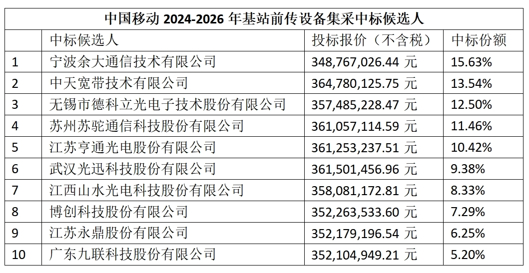 C114讯 11月29日消息(九九))中国移动采购与招标网今日发布2024年至2026年基站前传设备集中采购项目中标候选人公示,宁波余大通信技术有限公司、中天宽带技术有限公司等10家企业中标。