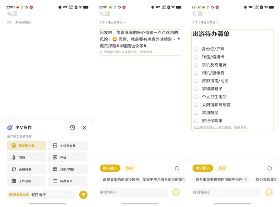 小V写作可以帮你撰写朋友圈文案,还可以帮你罗列清单,带来更便捷的体验。