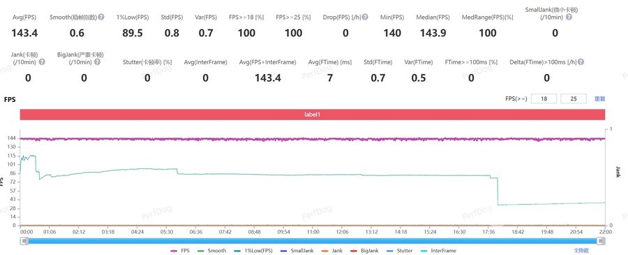 在iQOO Neo 10 Pro上,《和平精英》还可以支持超分超帧并发,既具备1.5K的高清画质,同时也可以实现144FPS的帧率,让你的每一次瞄准都更加清晰。经过PerfDog实测,iQOO Neo 10 Pro在开启超分超帧之后,运行《和平精英》的平均帧率为143.3FPS,帧率始终维持满帧表现。
