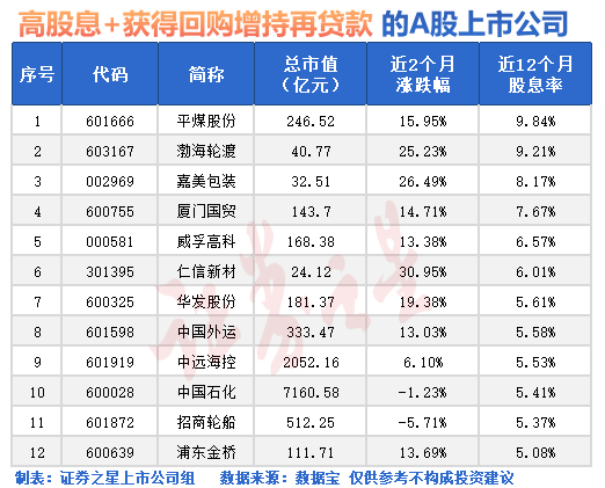 获批回购增持再贷款的公司中,有多只属于高股息标的。据证券之星统计,其中有38股近12个月股息率在3%以上,如平煤股份、渤海轮渡股息率均超9%。此外,嘉美包装、厦门国贸、威孚高科、仁信新材、华发股份、中国外运、中远海控、中国石化、招商轮船、浦东金桥等股息率均超5%。