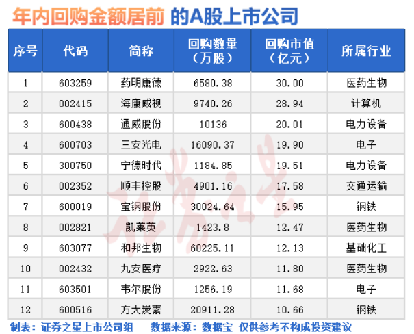其中,有388家公司回购金额破亿元,三安光电、宁德时代、顺丰控股、宝钢股份、凯莱英、和邦生物、九安医疗、韦尔股份、方大炭素等12家公司回购金额在10亿元以上。其中,药明康德、海康威视、通威股份分别以30亿元、28.94亿元、20.01亿元的回购金额排名前三。
