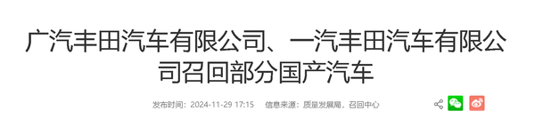 11月29日,国家市场监督管理总局发布公告显示,日前,广汽丰田汽车有限公司、一汽丰田汽车有限公司根据相关要求,向国家市场监督管理总局备案了召回计划。决定自2024年12月2日起召回以下车辆。