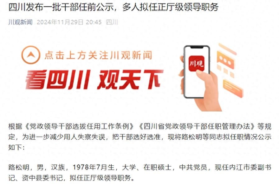 根据《党政领导干部选拔任用工作条例》《四川省党政领导干部任职管理办法》等规定,为进一步减少用人失察失误,把干部选好选准,现将路松明等同志拟任职情况公示如下: