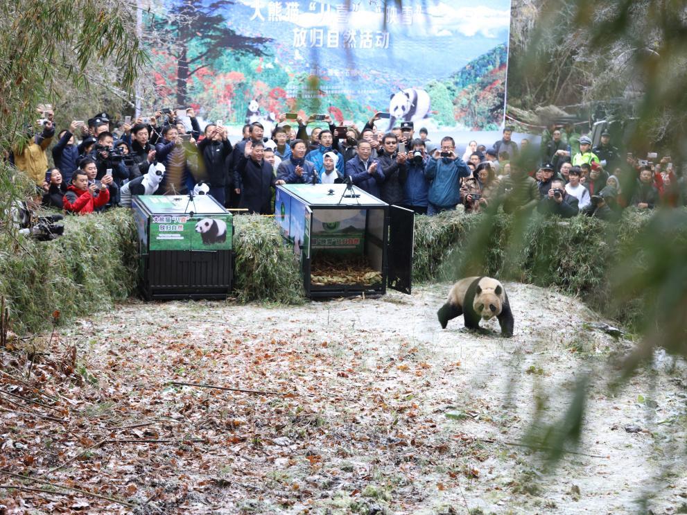 2017年11月23日,大熊猫“映雪”在四川雅安栗子坪国家级自然保护区回归大自然。(韩毅 摄)
