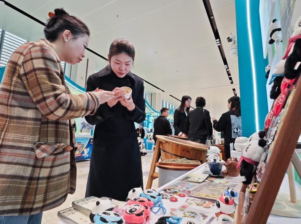 11月26日,参观者在2024全球熊猫伙伴大会的文创走廊了解文创产品。新华社记者江宏景 摄