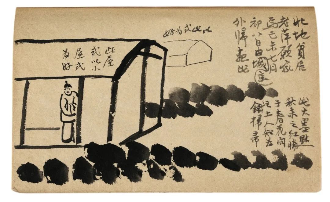 《己未日机》呈现了齐白石刚来北京时的心路历程,还记录了齐白石眼中的北京。日记的一到六页主要描绘了北京城风景旧貌,包括前门外浓烟滚滚,飞鸟落霞的晚景,矮小的屋舍,社稷坛黄昏时的柏树。其中日记第四页的小屋以及浓墨点染的花,表明自己来京贫居不得志,思家的心情。