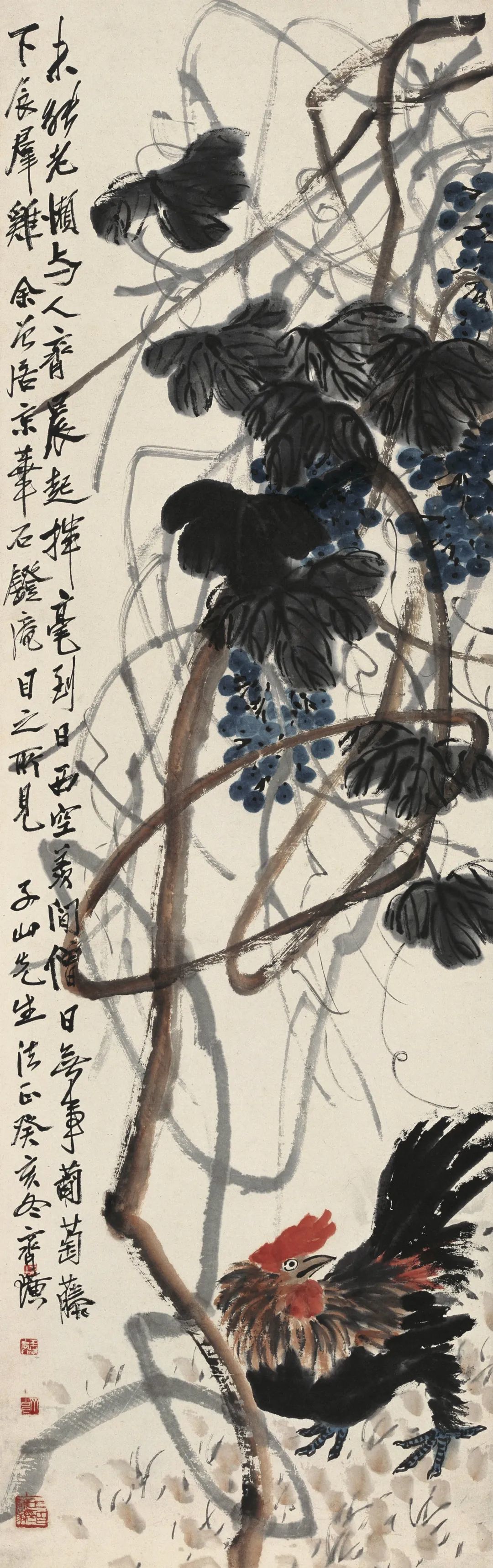 ▲ 齐白石 葡萄公鸡 立轴 纸本设色 179.5×54cm 1923 北京画院藏