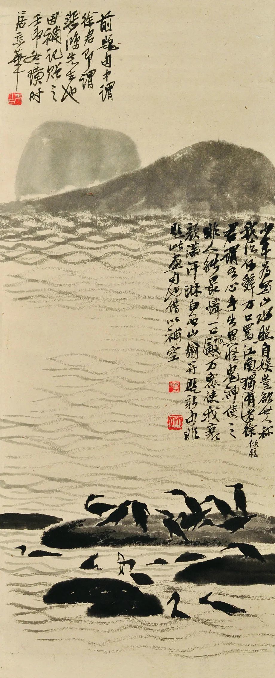 齐白石的山水画因太超前不被当时画坛所接受,真可谓“我法何辞万口骂”唯独徐悲鸿力排众议,不仅邀请齐白石到北平艺专任教,而且倾尽心力为其宣传。因此,齐白石精心为徐悲鸿画《山水》一幅相赠,感谢“江南倾胆独徐君”的知遇之恩。此画描绘江边的十余只鱼鹰,或潜入水中捕鱼,或立于石上休憩,虽只是简单的墨线,却姿态各异,刻画极为生动。这些鱼鹰来源于1904年齐白石在南昌赣江边的写生稿,远山则是他1905年游历桂林山水后,以平涂的方式表现孤峰独立的山形。江面以绵长柔韧的线条表现水波的荡漾。全画具有浓郁的生活情趣。