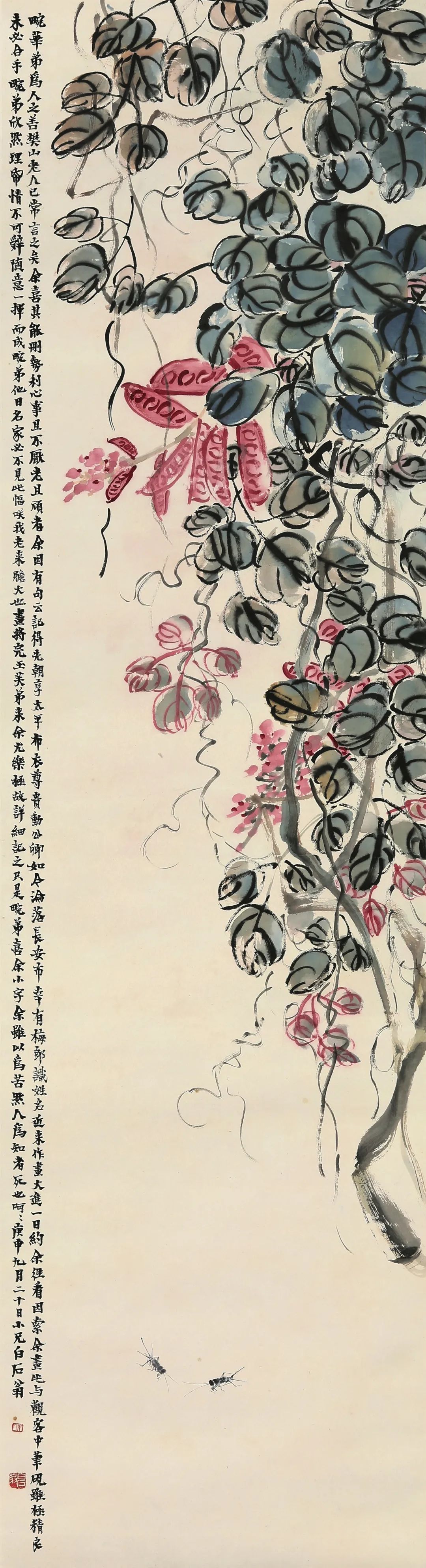 《白石老人自述》中齐白石称1920 年九月,齐如山约齐白石前往梅兰芳的缀玉轩,当就是《豆角蟋蟀》落款的“庚申九月二十日”。画面上齐白石描绘了纷乱灵动的豆荚藤蔓和叶子,红色的豆荚鲜艳夺目,画面下方的两只蟋蟀十分精细,可见齐白石用心之极。画幅左侧题上了两行跋文,首先说道,梅兰芳为人善良,樊樊山也常常这么说 ;其二,齐白石第三次言及姚玉芙婚礼上梅兰芳为其解困之诗 ;之后齐白石说梅兰芳亲自为他理纸,觉得梅兰芳的笔砚虽极为精良,但是并不合手,梅兰芳盛情难却,于是齐白石一挥而就。画完的时候,姚玉芙来了,齐白石“乐极”,用梅兰芳喜欢的小字工整写下金冬心体跋文。