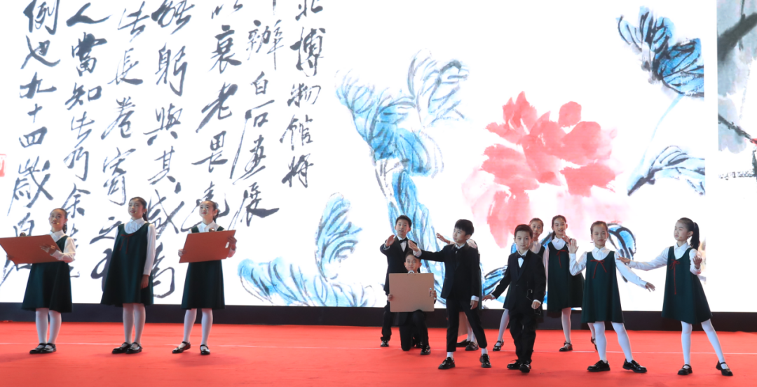 ▲ 首都博物馆韩战明馆长、北京画院吴洪亮院长、荣宝斋有限公司赵东书记、宋庆龄和平天使艺术团潘易点小朋友一同登台,借白石老人之作,为现场嘉宾送出祝福