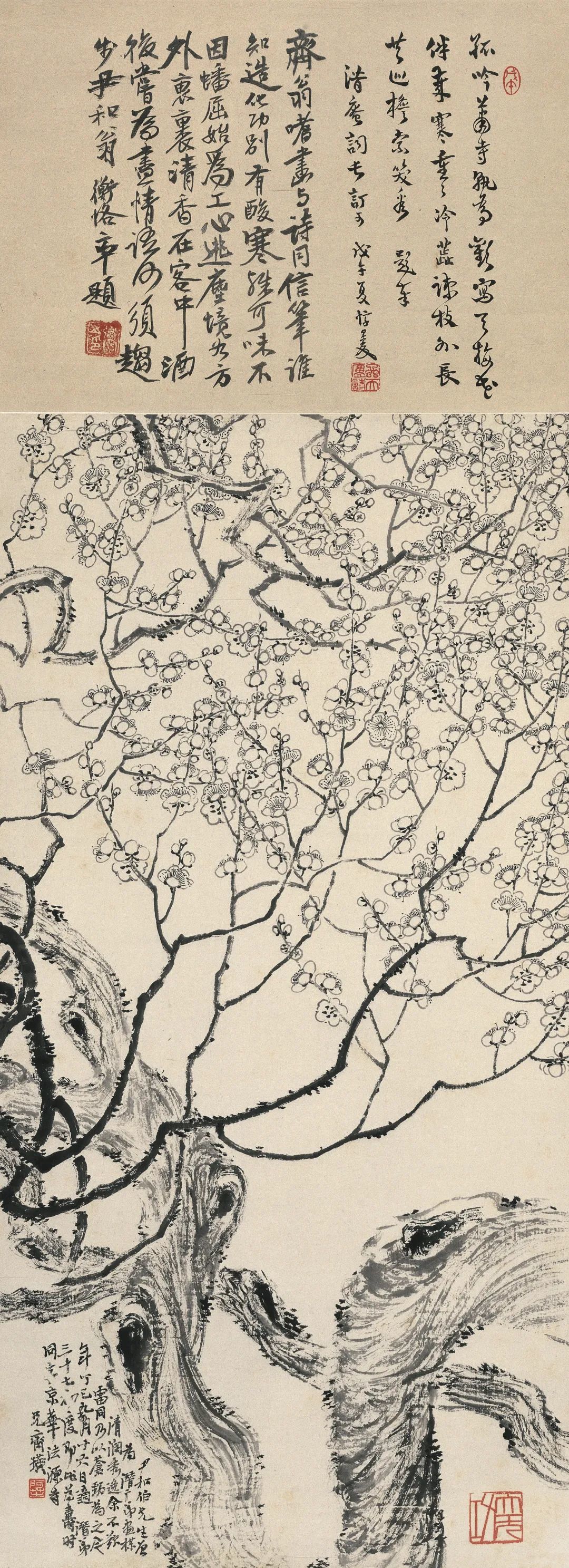 《墨梅》一幅是齐白石为杨潜庵 37 岁生日而作。淡墨勾勒出饱满的朵朵梅花,花朵与花苞交叠相映。梅花的新枝与老干交错相生,树干的遒劲厚重与花枝的轻健俏丽形成对比。不同于尹和伯墨梅的清秀俊逸,齐白石的墨梅“以苍劲为之”。挚友陈师曾在画作上题跋“酒后尝为尽情语,何须趋步尹和翁”劝他不必追随前人脚步,而要变革创新。同一时间,北京四大书法家之一的罗复堪也题诗赞许他身处寒寺,与寒梅为伴,笑看人间的姿态。这是齐白石衰年变法的起点,从此时起,齐白石决定不再拘泥于临摹前人的作品,开始创造属于自己的风格。