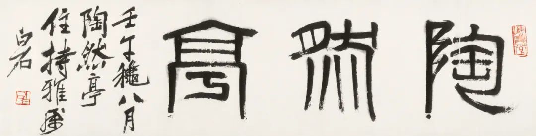 《陶然亭》篆书书法是 1942 年秋齐白石为陶然亭慈悲禅林的主持僧慈安所写。齐白石在四十年代时曾想在陶然亭寻觅生圹,在张次溪的帮助下,住持慈安慨然以亭东地一段割赠,二人因此结缘。现在陶然亭慈悲庵内悬挂的木匾字迹即从此幅书法而来。“陶然亭”三字用笔方折劲挺,结构谨严, 方折的笔画中融入了淋漓痛快的篆刻刀法。结体以《三公山碑》为基,并运用了《天发神谶碑》大起大落的用笔特点,使字形卓茂雄肆,但方 折中兼有《禅国山碑》的圆润 ,大有古人所倡“折钗股”之妙 质。齐白石的篆书取法《三公山碑》、《天发神谶碑》、《禅国山 碑》在民国时期是颇为大胆和自信的。同时期的书家对此三碑 大多望而却步,而白石老人则独出蹊径,以此三碑为创作基础,化古出新。“陶然亭”横批代表了齐白石匾额书法的特殊风貌,这与京城中众多风格的匾额面貌迥异,彰显出白石老人过人的胆识和独有的艺术理念。