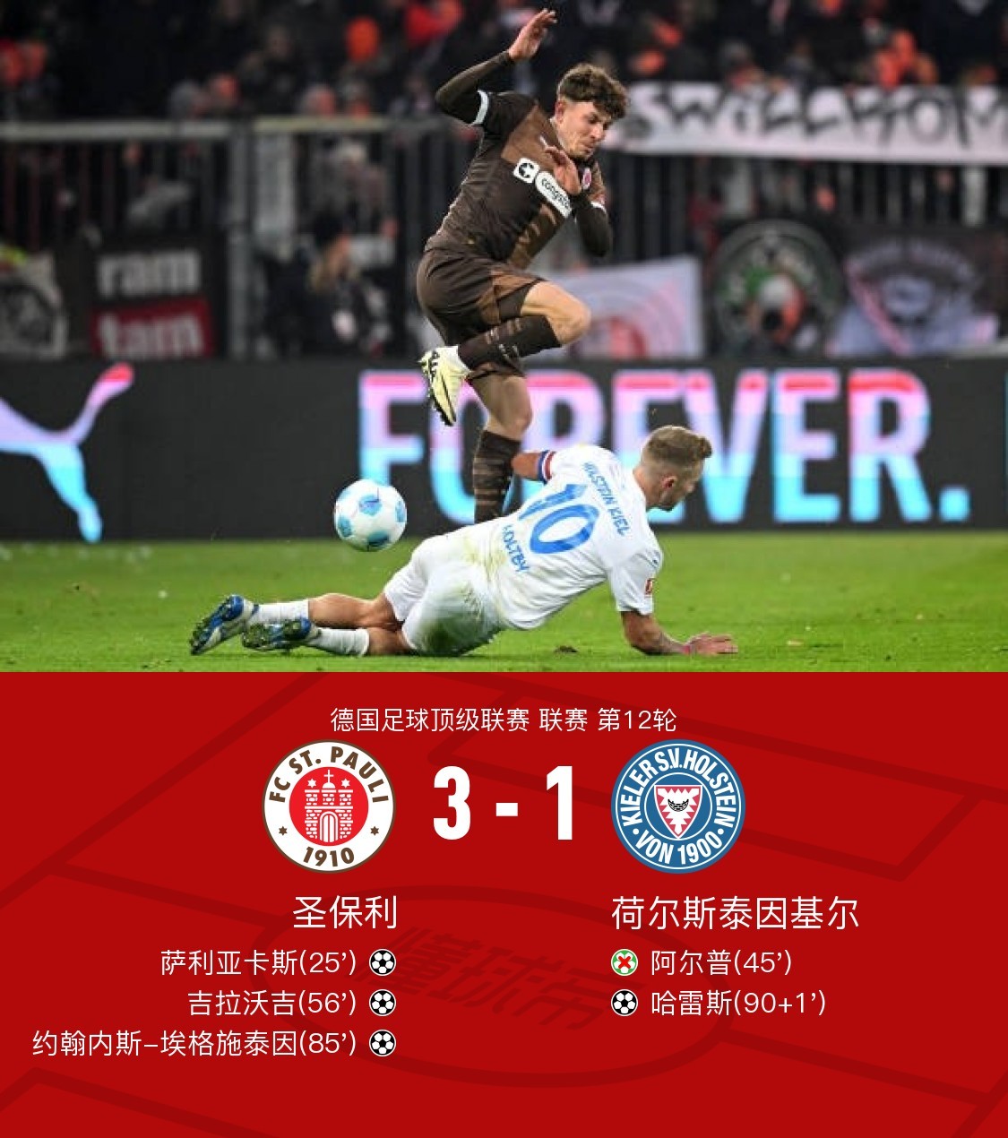 在德国足球顶级联赛第12轮的较量中,圣保利坐镇主场迎战荷尔斯泰因基尔。比赛中,圣保利展现了强大的进攻实力。首先,约翰内斯-埃格施泰因为萨利亚卡斯送出精妙助攻,帮助球队取得领先。随后,荷尔斯泰因基尔错失了一次点球良机,未能将比分扳平。 下半场,约翰内斯-埃格施泰因再次成为关键人物,他的传球助攻吉拉沃吉再下一城,扩大了圣保利的领先优势。比赛接近尾声时,菲利普-特罗伊为约翰内斯-埃格施泰因送上助攻,后者成功破门,为圣保利锁定胜局。 尽管在比赛最后阶段,荷尔斯泰因基尔由皮希勒助攻哈雷斯打入一球,但为时已晚。最终,圣保利以3-1的比分战胜荷尔斯泰因基尔,取得了本场比赛的胜利。