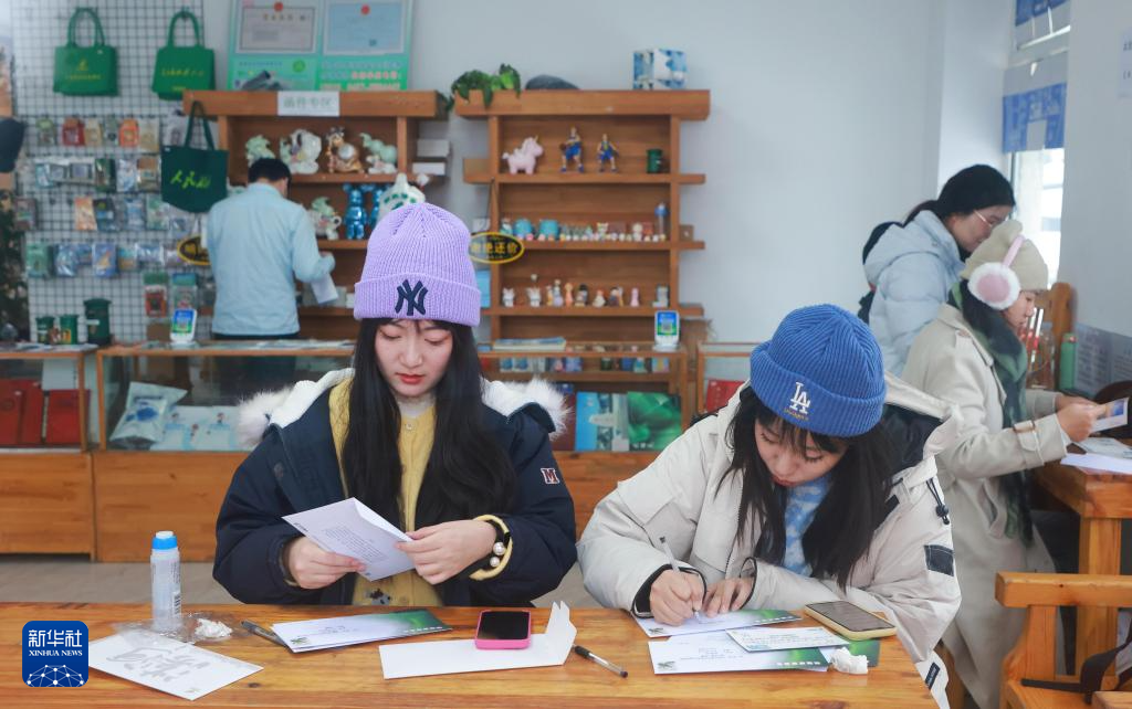 11月27日,游客在漠河市北极村的中国最北邮局填写明信片。