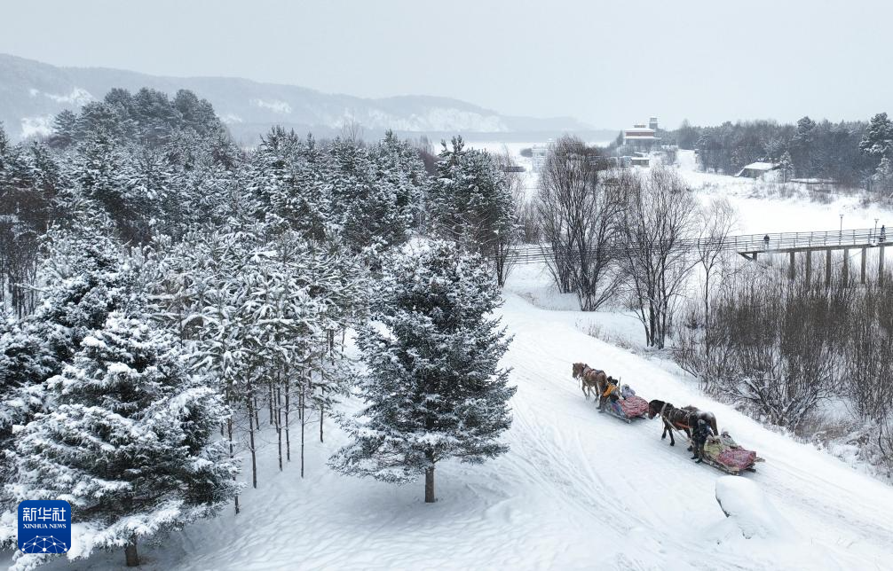 11月27日,游客在漠河市北极村体验马拉爬犁项目(无人机照片)。