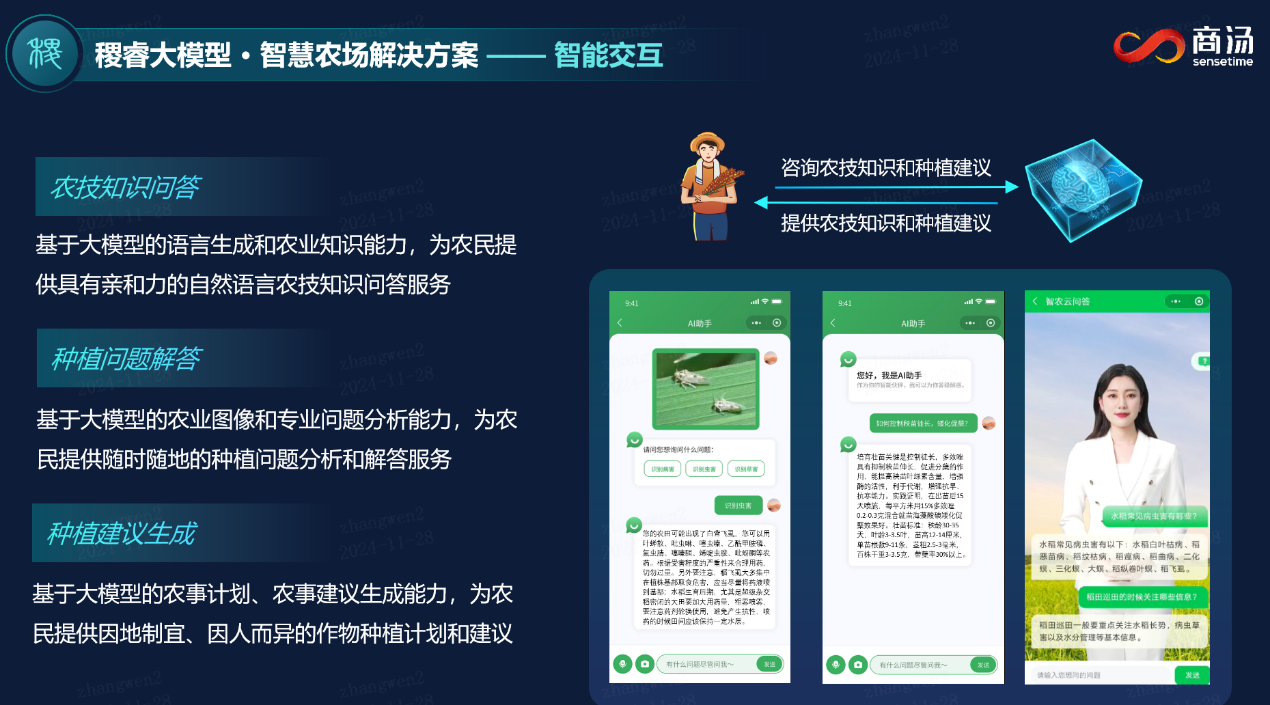 11月28日举行的第二十一届中国国际农产品交易会(简称“农交会”)的“新质生产力赋能现代农业创新发展——人工智能与区块链技术融合发展”分享会上,商汤科技发布面向稷睿种植决策大模型以及基于该模型的稷睿大模型·智慧农场解决方案。
