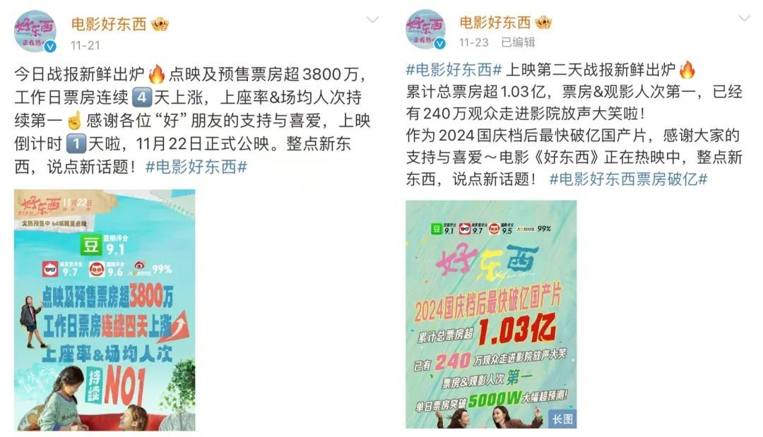 即便有前作《爱情神话》积累的口碑基础,但《好东西》既没有鲜明的地域属性,也没有像徐峥一样在当时具有更大票房号召力的喜剧演员,实际上很难形成更大范围的破圈效应,票房天花板非常明显。借助出色的口碑营销,影片目前已经算是实现了一次突围。