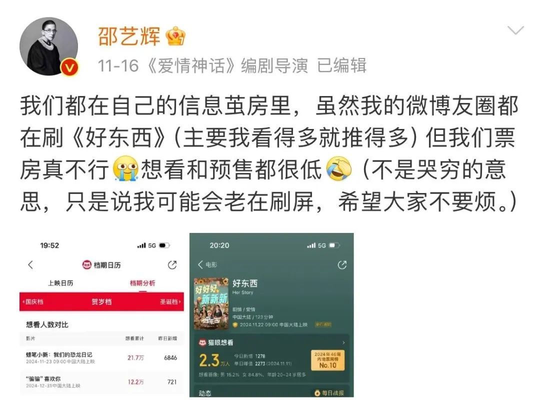即便一轮点映后好评如潮,11月16日开始的二轮点映,范围扩大至一二线64城,但想看和预售数据仍旧没有太大起色,导演邵艺辉也发文求扩散。
