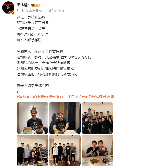 11月30日,是羽毛球运动员梁伟铿的生日。他在社交媒体上晒出多张照片,并发文为自己庆生。