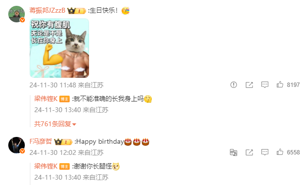 此外,队友蒋振邦、冯彦哲、刘圣书、魏雅欣、刘雨辰等人也纷纷送上祝福。